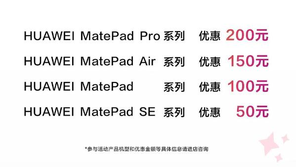 此次教育優(yōu)惠適用于華為MatePad Pro系列、MatePad Air系列、MatePad系列、MatePad SE系列,最高優(yōu)惠可達200元。