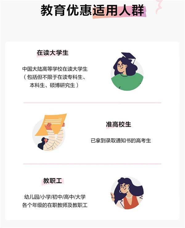 該優(yōu)惠面向在讀大學生、準高校生、各年級的在職教師及教職工,而且還能與常規(guī)優(yōu)惠疊加使用。