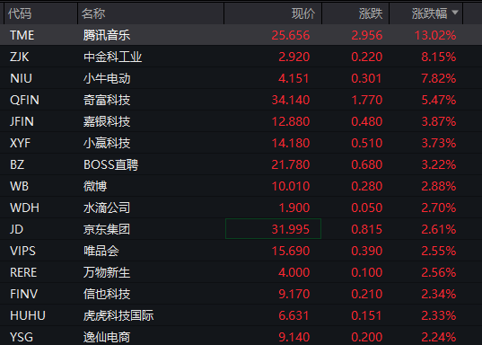 在熱門中概股里,騰訊音樂漲超13%,中金科工業(yè)、小牛電動(dòng)、奇富科技等漲幅超過5%。