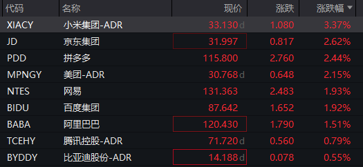 萬得中概科技龍頭指數(shù)漲幅超過1.6%,其中,小米集團(tuán)ADR漲超3%,京東集團(tuán)、拼多多、美團(tuán)ADR漲超2%,網(wǎng)易、百度、阿里巴巴漲超1%。