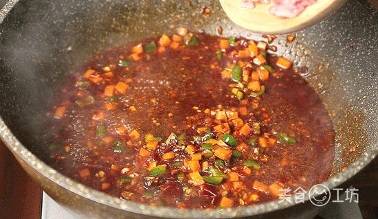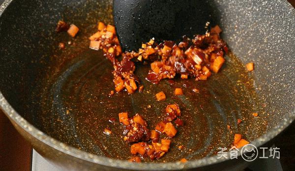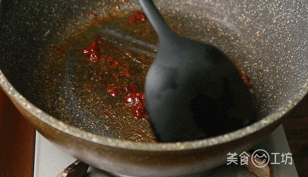 4. 鍋中倒少許油,油熱后放入豆瓣醬炒出紅油。