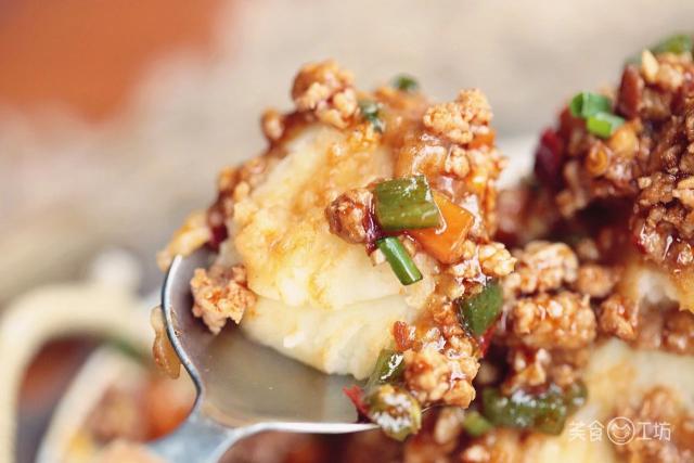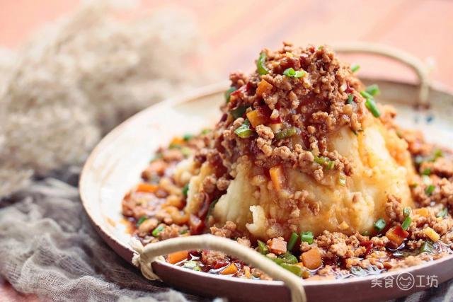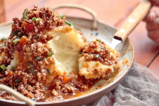 不過(guò)這沒做成攪團(tuán)的土豆泥,美食君也沒浪費(fèi),把土豆泥堆起來(lái),再澆上鮮辣的肉末澆頭,就像一座噴發(fā)的火山。