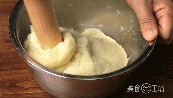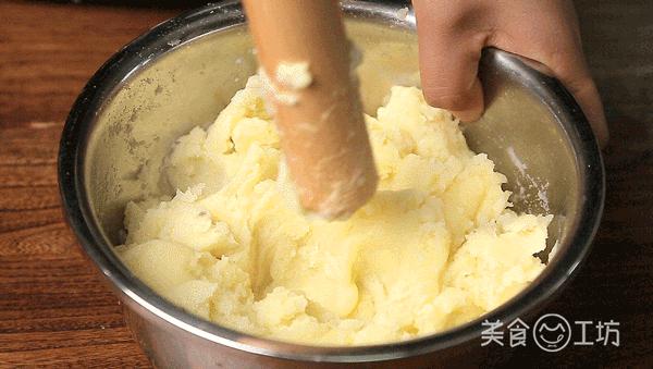 2. 將蒸好的土豆倒入盆中,用搟面杖捶搗。