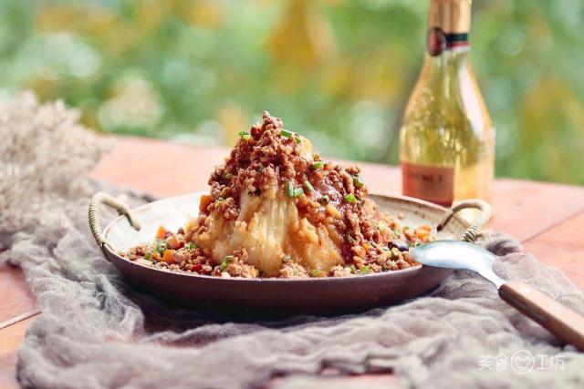 7. 用土豆泥在盤子里堆成火山狀,澆上炒好的肉醬,撒上蔥花就大功告成啦。