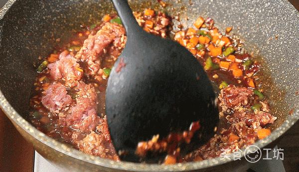 6. 倒入適量的老抽、生抽、蠔油和清水,放入豬肉末,翻炒均勻。