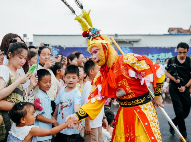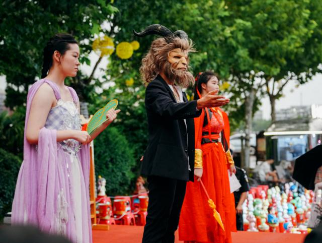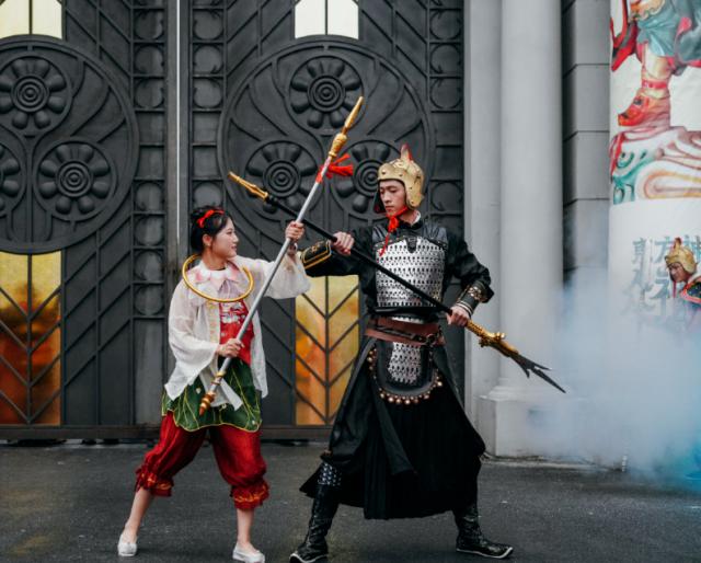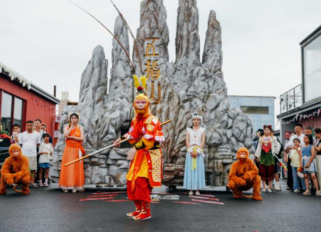 踏入上海影視樂(lè)園,一場(chǎng)場(chǎng)“神魔大戲”接連上演。樂(lè)園西門口的噴泉幻化成“五指山”,“齊天大圣”驚艷登場(chǎng);南天門前,二郎神與哪吒劍拔弩張,孫悟空大笑勸和并結(jié)義,熱血沸騰的“反戈”大戰(zhàn)一觸即發(fā);在眾多小劇場(chǎng)里,牛魔王、紅孩兒、八戒、嫦娥等大家熟悉的角色輪番亮相;來(lái)到和平廣場(chǎng),原本觥籌交錯(cuò)的“蟠桃盛宴”風(fēng)云突變,眾神聯(lián)手破局的大戰(zhàn)在五彩光芒中把氣氛推向頂點(diǎn)。