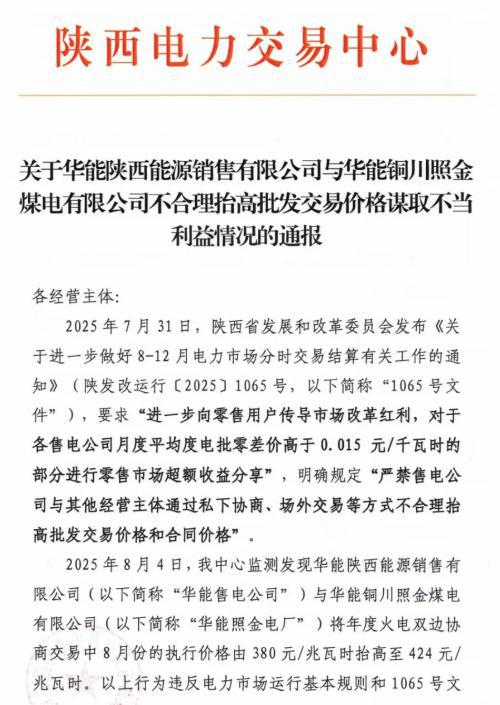8月7日,陜西電力交易中心對(duì)隸屬華能集團(tuán)的華能陜西售電與華能銅川照金煤電兩公司予以重罰,包括紅牌警告、信用扣分、暫停相關(guān)資格等,原因是兩公司串謀抬高8月火電交易價(jià)格,違反相關(guān)規(guī)定,侵害用戶權(quán)益、擾亂市場(chǎng)秩序。