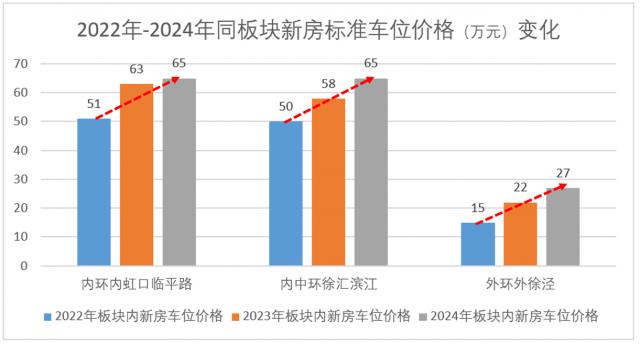 我選取了內(nèi)環(huán)內(nèi)、內(nèi)中環(huán)和外環(huán)外三個典型板塊,發(fā)現(xiàn)這幾年新房標(biāo)準(zhǔn)車位價格均有不同程度上漲。