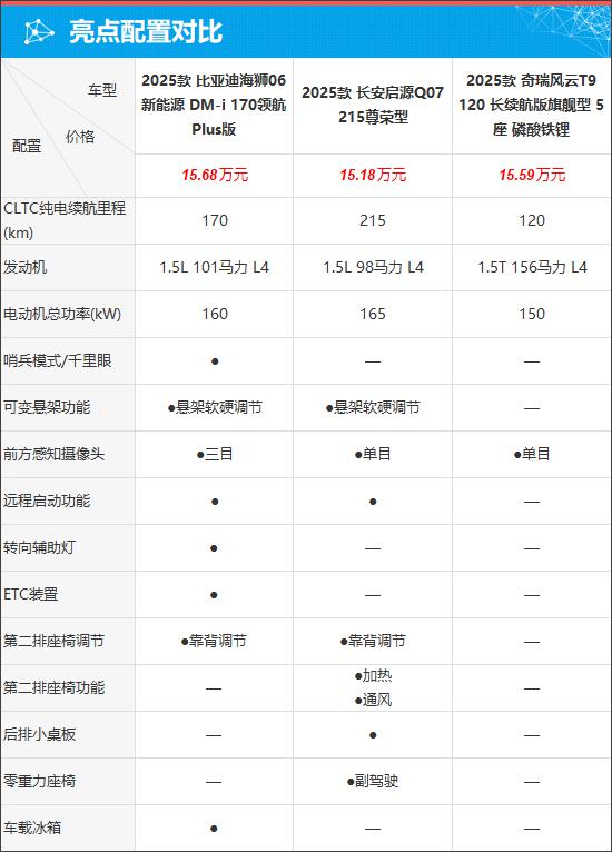 具體到車輛配置層面,通過對比可知,比亞迪海獅06 DM - i與長安啟源Q07實力相當,但側(cè)重點不同。海獅06 DM - i獨享哨兵模式 / 千里眼、轉(zhuǎn)向輔助燈、ETC裝置以及車載冰箱;長安啟源Q07則獨享第二排座椅加熱 / 通風(fēng)、后排小桌板以及副駕駛零重力座椅。哪款更符合您的需求,還得看您的實際用車情況。相比之下,奇瑞風(fēng)云T9的配置表現(xiàn)略顯遜色。