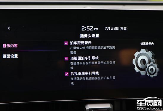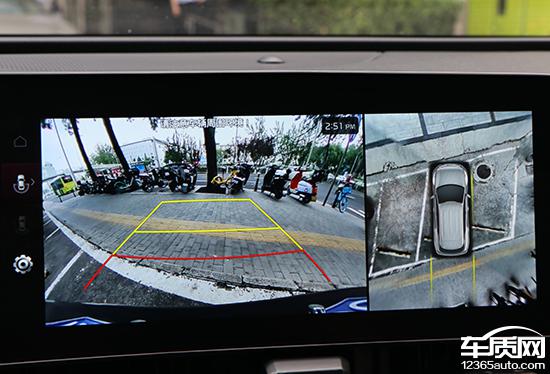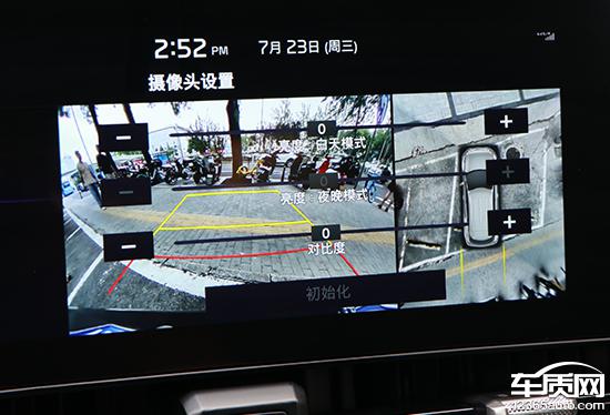 評測車的360°全景影像支持多角度顯示,畫面清晰度一般,但有攝像頭設(shè)置可調(diào)節(jié)亮度和對比度?;兛刂屏己?,影像帶有可隨動倒車輔助線,為駕駛員提供參考。