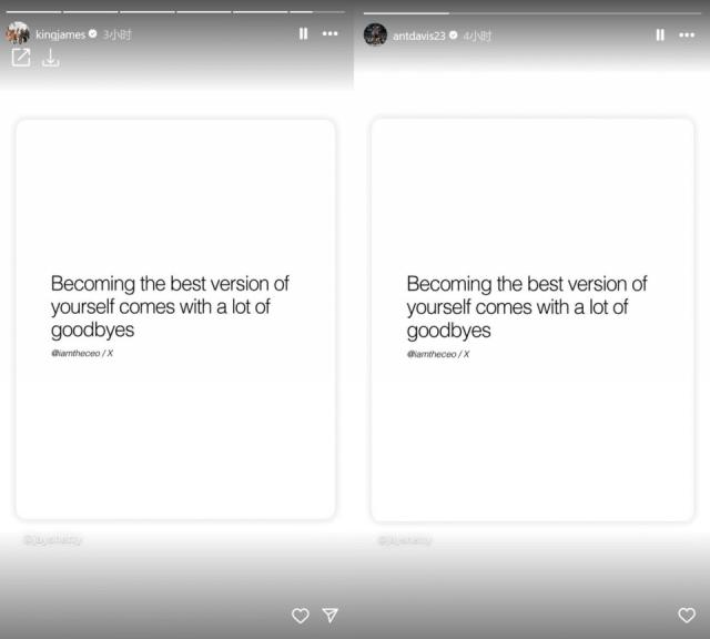值得注意的是,詹姆斯和獨(dú)行俠隊(duì)球星戴維斯在各自社媒上曬出相同箴言:“成為最好的自己,總要經(jīng)歷許多次告別?!弊?019 - 2020賽季起,詹姆斯與戴維斯做了5個(gè)半賽季的隊(duì)友。上賽季中期,戴維斯在涉及東契奇的交易中,被湖人隊(duì)送至獨(dú)行俠隊(duì)。