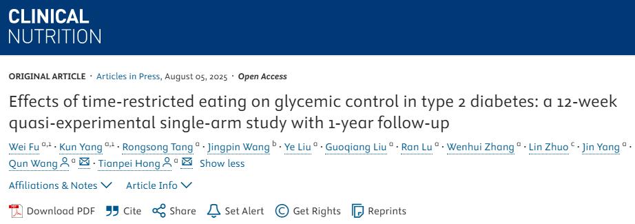 ①Fu W, Yang K, et al, Effects of time - restricted eating on glycemic control in type 2 diabetes: a 12 - week quasi - experimental single - arm study with 1 - year follow - up, Clinical Nutrition.