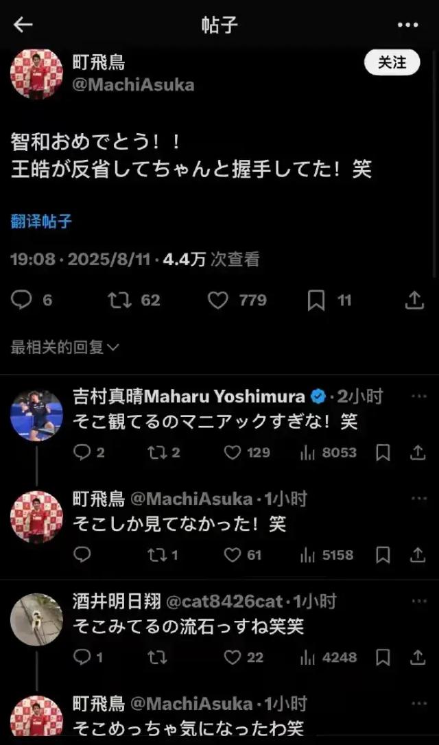 在社交媒體互動(dòng)中,町飛鳥(niǎo)與酒井明日翔就某細(xì)節(jié)展開(kāi)討論,町飛鳥(niǎo)表示特別關(guān)注,酒井則調(diào)侃他觀察細(xì)致。這反映出公眾對(duì)賽事細(xì)節(jié)的高度敏感。