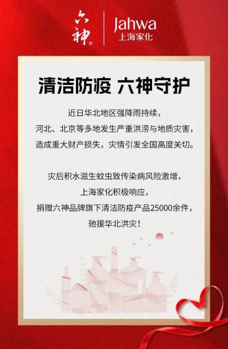 鑒于華北洪澇災(zāi)害后,積淤污染、水源污染以及蚊蠅滋生使得傳染病風(fēng)險(xiǎn)大幅上升的緊急情況,上海家化第一時(shí)間響應(yīng),緊急調(diào)撥了六神驅(qū)蚊花露水、六神艾葉抑菌洗手液、六神艾葉健膚沐浴露等清潔防疫產(chǎn)品,總數(shù)超過25000件。同時(shí),聯(lián)合中國婦女發(fā)展基金會(huì),將這批物資精準(zhǔn)地送到受災(zāi)婦女及家庭手中,助力災(zāi)后的清潔防疫工作,守護(hù)群眾的健康與安全。