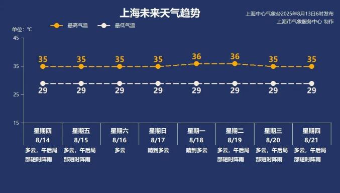 未來幾天申城氣溫會維持在29℃ - 36℃之間,本周剩余工作日仍是“高溫 + 午后局部陣雨”的天氣格局。從周六開始,申城受強烈下沉氣流控制,對流可能性降低,上海將進入“炙烤”模式,預計此輪高溫過程持續(xù)時間較長。