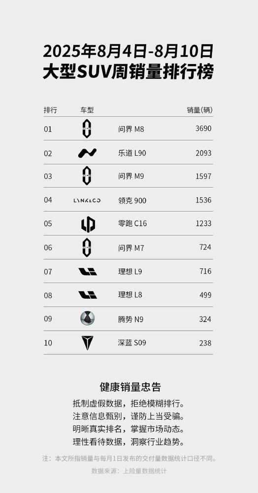 【CNMO 科技消息】曾經(jīng),中國(guó)大型 SUV 這一細(xì)分市場(chǎng)長(zhǎng)期被眾多國(guó)際品牌占據(jù)主導(dǎo)地位。不過,隨著問界、理想、蔚來、領(lǐng)克和零跑等中國(guó)自主品牌的迅速崛起,如今大型 SUV 市場(chǎng)的格局已發(fā)生了明顯變化。根據(jù)最新數(shù)據(jù),在 2025 年 8 月 4 日至 8 月 10 日期間,國(guó)產(chǎn)大型 SUV 銷量排名前十的車型如下: