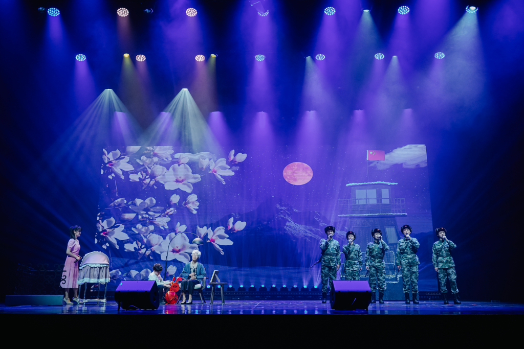 情景表演唱《捧一把月光》舞臺(tái)分為兩邊,一部分是邊疆哨所,一部分是上海城市。