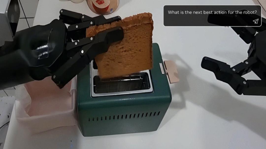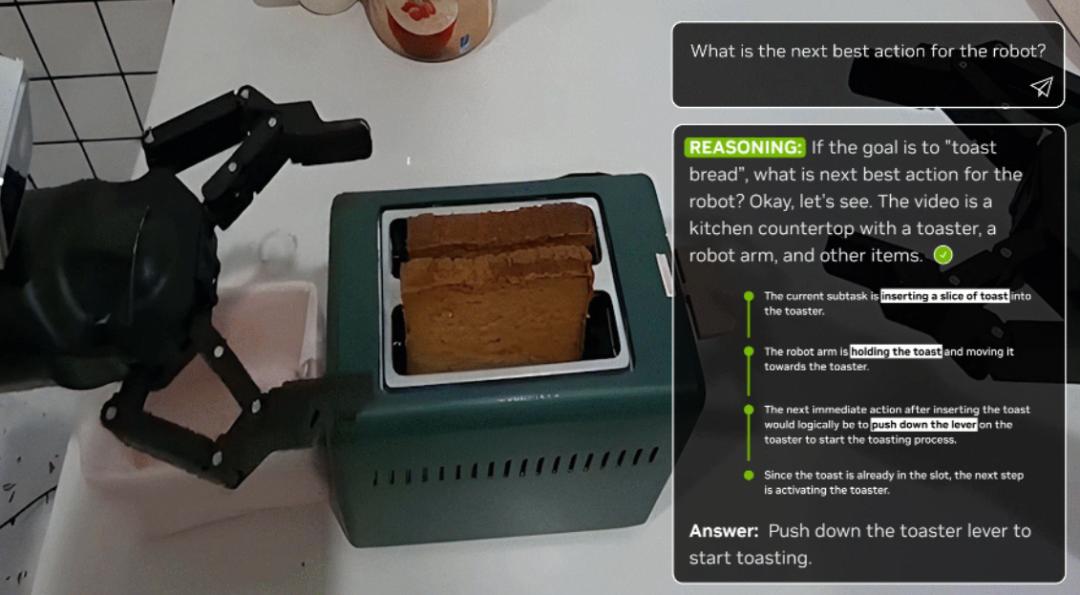 在英偉達(dá)給出的案例中,運(yùn)行視覺推理模型的機(jī)器人手臂,依據(jù)“面包 + 烤面包機(jī)”的場(chǎng)景,成功推斷出最合理的下一步動(dòng)作是將面包放進(jìn)烤面包機(jī)烘烤,并把思考邏輯轉(zhuǎn)化為機(jī)器手臂的操作指令。