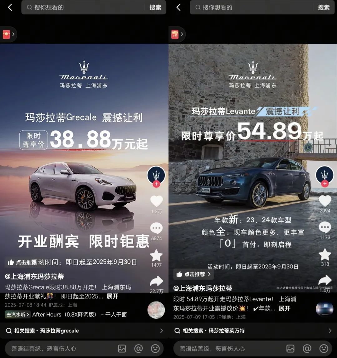 2025年7月,“上海浦東瑪莎拉蒂”發(fā)布的新車促銷抖音短視頻被大量轉(zhuǎn)發(fā)。視頻中,白色的瑪莎拉蒂SUV車型Grecale(格雷嘉)十分醒目,而文案更吸引人:“只需38.88萬元,就能成為瑪莎拉蒂車主,速來?!?/p>
