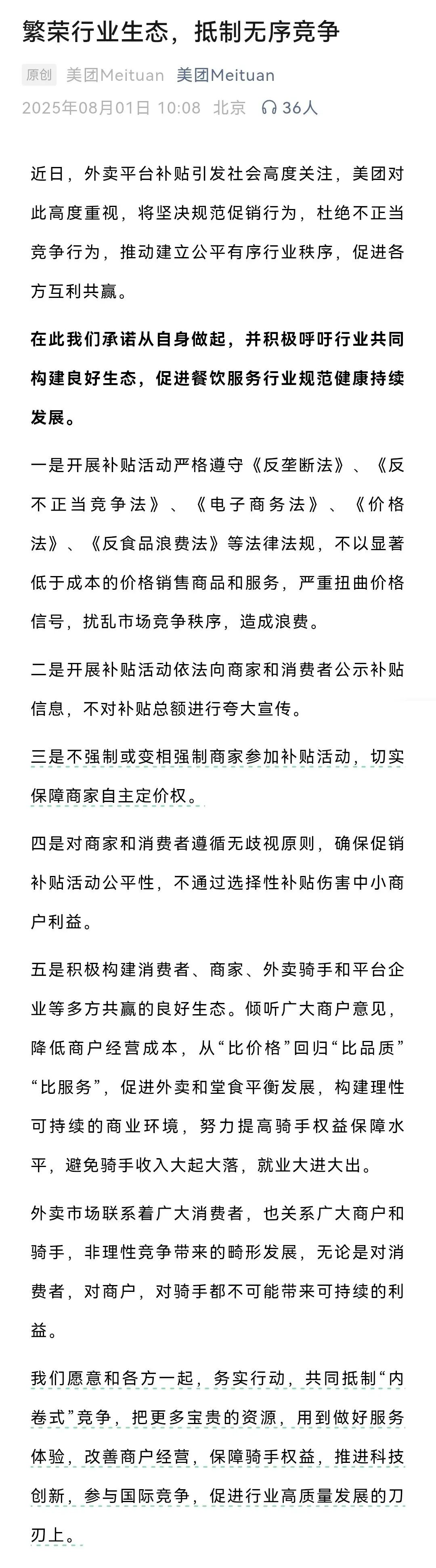8月1日,美團(tuán)、餓了么、京東三大外賣平臺(tái)聲明抵制惡性“內(nèi)卷式”競(jìng)爭(zhēng),補(bǔ)貼理性化并讓商家自主決策,共同構(gòu)建良好行業(yè)生態(tài),實(shí)現(xiàn)多方共贏。