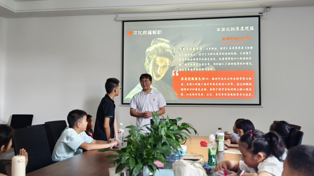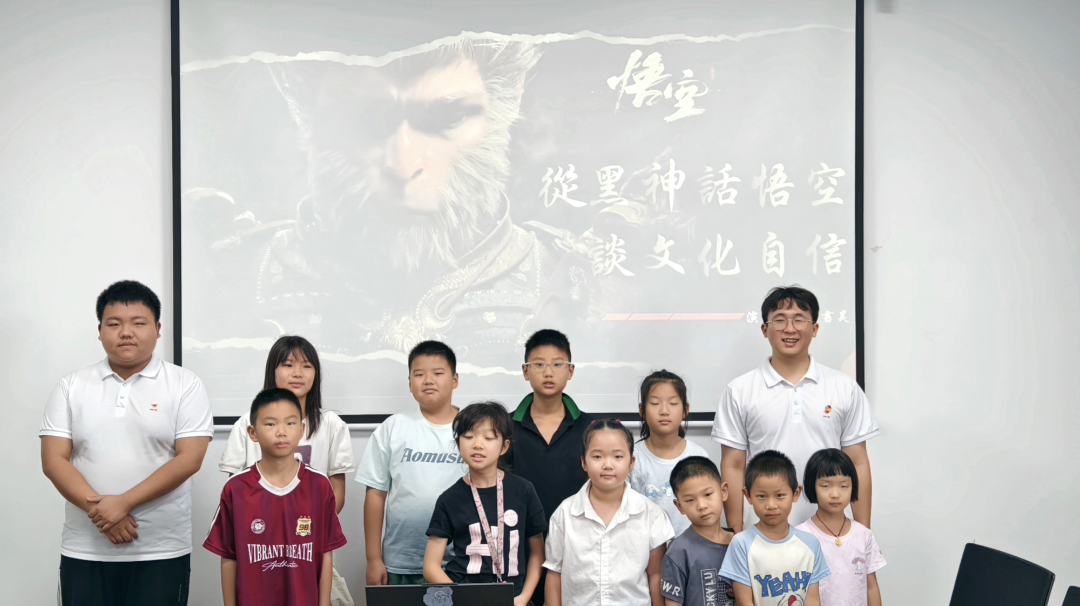 隨后,來自湖北大學(xué)的尹書昊和來自湖北中醫(yī)藥大學(xué)的嚴(yán)心語聯(lián)合開設(shè)的“從黑神話悟空談文化自信”專題課程,也備受孩子們喜愛。兩位志愿者結(jié)合游戲?qū)嵕芭c國風(fēng)元素,深入淺出地解析了“金箍棒”“筋斗云”等傳統(tǒng)符號背后的文化密碼,引導(dǎo)學(xué)生理解文化IP如何助力中國故事走向世界。課程結(jié)束時,孩子們反應(yīng)熱烈,舉手投足間展現(xiàn)出對中華優(yōu)秀傳統(tǒng)文化的全新理解和自信認(rèn)同。