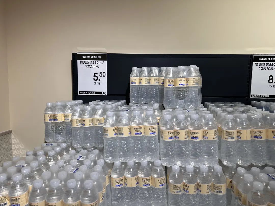 以瓶裝水為例,物美超值自營品牌飲用水5塊5一箱(12瓶),一瓶不到五毛錢。旁邊怡寶瓶裝水9塊8一提(12瓶),價格遠低于電商平臺,“水中貴族”百歲山在硬折扣商超也只要1塊9毛8。