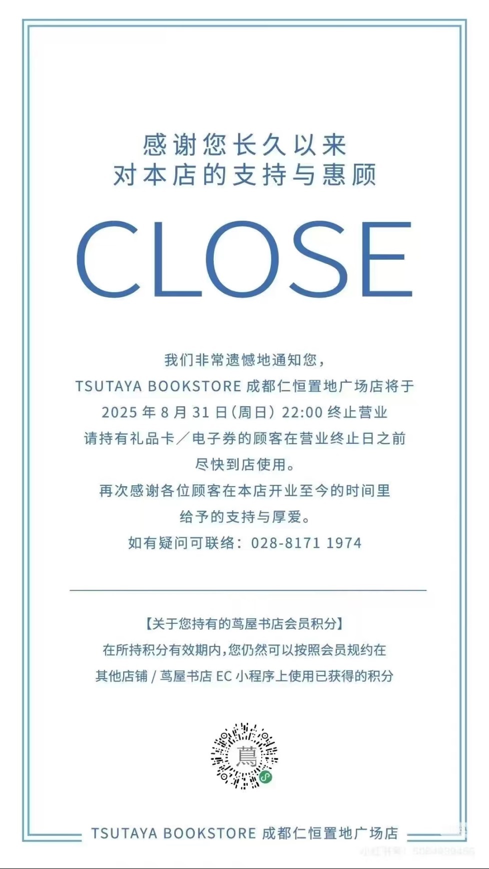 8月11日,成都仁恒置地廣場(chǎng)蔦屋書店發(fā)布公告,該店將于2025年8月31日終止?fàn)I業(yè)。同時(shí),店方提醒持有禮品卡或電子券的顧客在營業(yè)終止日前盡快到店使用。