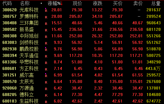 AI產(chǎn)業(yè)鏈股盤中大幅拉升,截至收盤,光庫科技、羅博特科20%漲停,新易盛漲超15%,中際旭創(chuàng)漲近12%,工業(yè)富聯(lián)強勢漲停,劍橋科技逼近漲停。光庫科技、新易盛、中際旭創(chuàng)、工業(yè)富聯(lián)均創(chuàng)歷史新高。