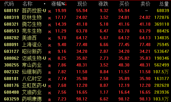 創(chuàng)新藥概念盤中強勢上揚,截至收盤,首藥控股20%漲停,微芯生物漲超14%,美迪西、昭衍新藥漲超9%,藥明康德漲逾7%。