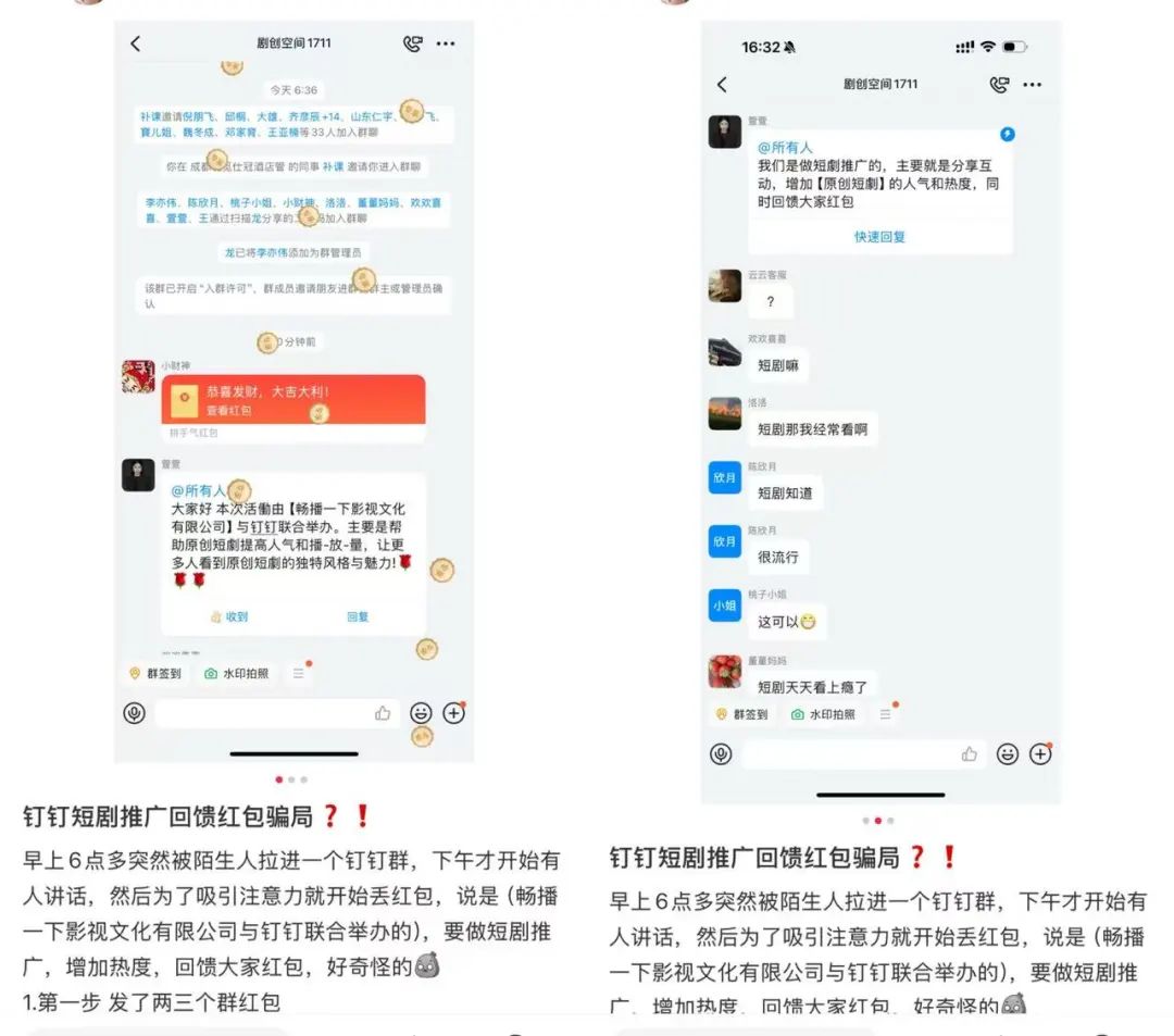 據(jù)一位發(fā)帖網(wǎng)友稱,早上6點多,他突然被陌生人拉進(jìn)一個釘釘群,直到當(dāng)日下午群內(nèi)才有動靜。有人發(fā)了個紅包后稱:“本次活動由暢播一下影視文化有限公司與釘釘聯(lián)合舉辦,主要是幫助原創(chuàng)短劇提高人氣和播放量,讓更多人感受原創(chuàng)短劇的獨特風(fēng)格與魅力?!边€表示是做短劇推廣的,通過分享互動增加原創(chuàng)短劇的人氣和熱度,同時回饋大紅包。