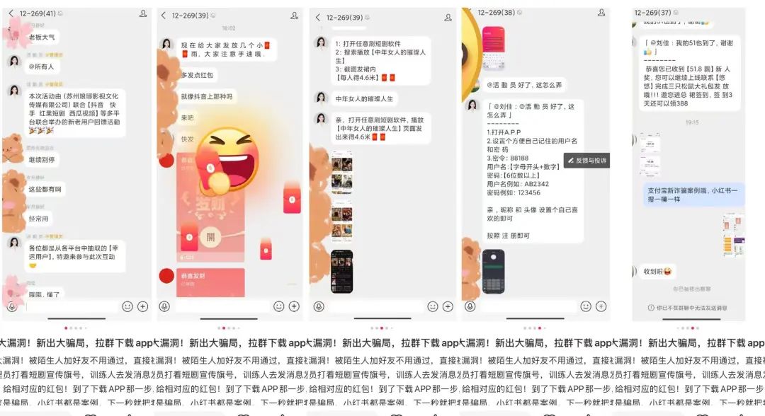 不過,也有人機智躲過了騙局。有網(wǎng)友被拉進(jìn)支付寶群,管理員稱活動由(蘇州瑯琊影視文化傳媒有限公司)聯(lián)合【抖音 快手 紅果短劇 西瓜視頻】等多平臺舉辦新老用戶反饋活動,呼吁大家打開短劇平臺搜索短劇并截圖發(fā)群里,隨后順勢吸引大家下載他們的App。