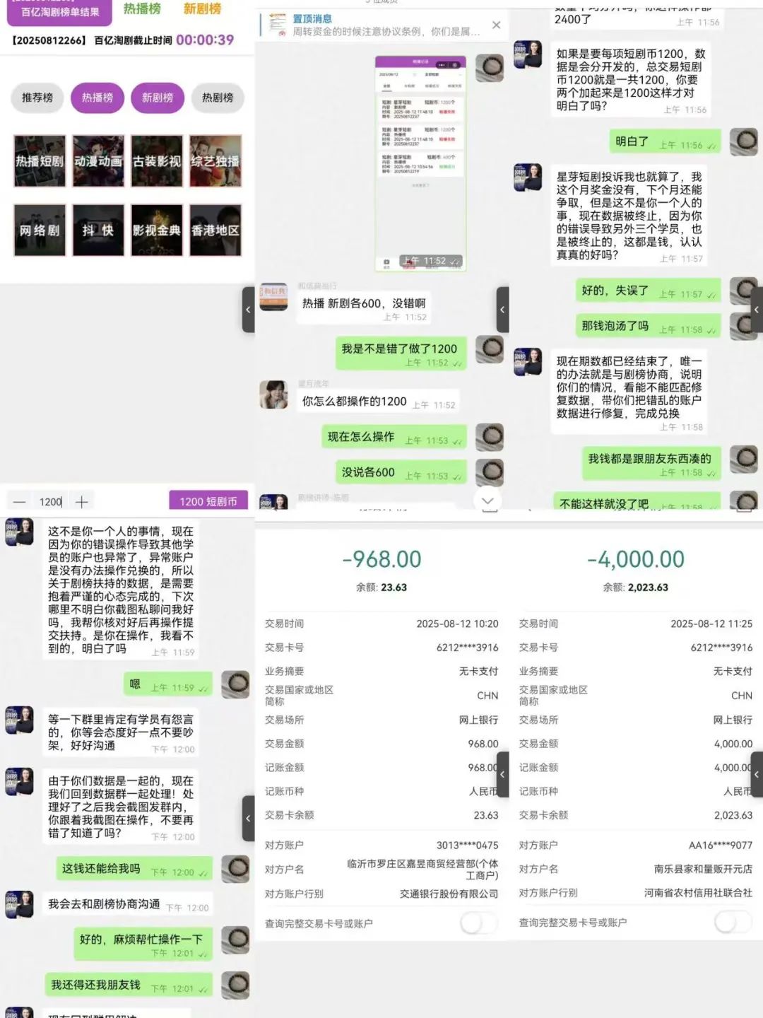 除了釘釘群,在支付寶也有類似騙局。一位網(wǎng)友在8月10日凌晨,被“大慶高新區(qū)伊貝美發(fā)店”加好友并拉進(jìn)一個33人的支付寶群,對方稱是調(diào)研視頻短劇愛好,回答問題陸續(xù)給38元獎勵。該網(wǎng)友領(lǐng)紅包上頭后,對方給了個鏈接,讓他每天按時在App里做任務(wù),搜短劇、簽到、查看劇榜數(shù)據(jù)等都有獎勵。他連續(xù)做了兩天任務(wù),第三天付款968元返1368元后,觸發(fā)了4000元返5200元的返現(xiàn)任務(wù)。結(jié)果咬牙付款4000元后,才發(fā)現(xiàn)是個騙局。