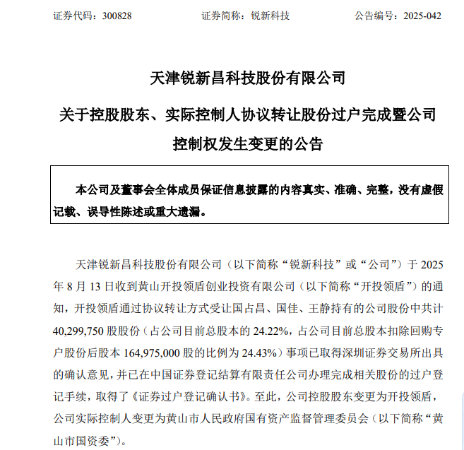 時(shí)隔4個(gè)半月,銳新科技正式迎來(lái)黃山國(guó)資入主。