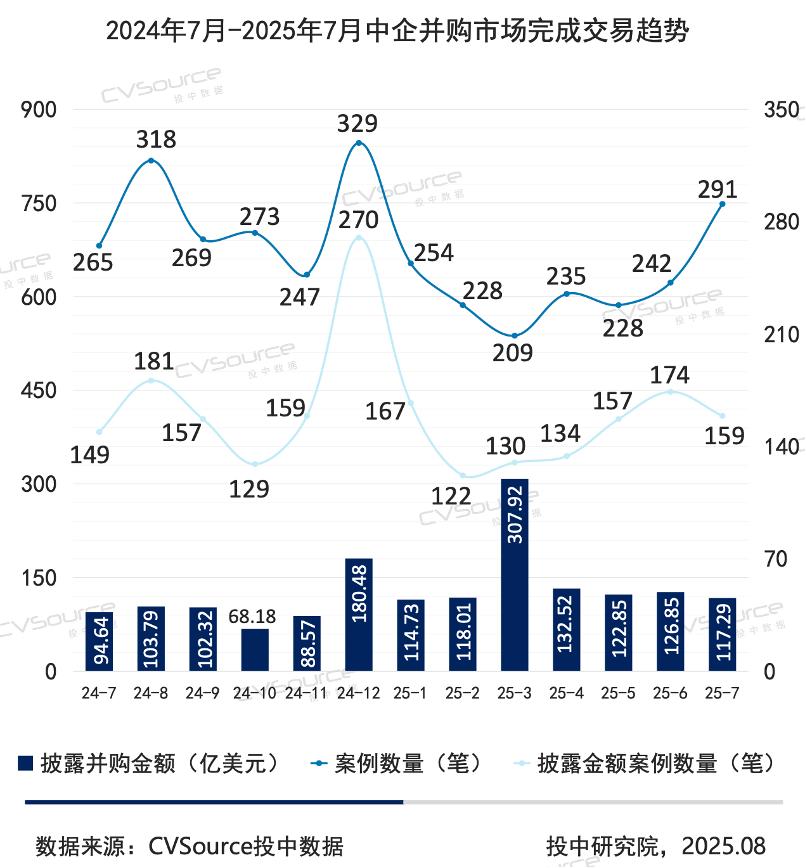 上周末,投中嘉川團隊發(fā)布的《7月并購報告》顯示,2025年7月,并購市場出現(xiàn)了“量升價穩(wěn)”的回暖跡象。當月完成291筆并購交易,同比增加近10%,總金額達117.29億美元,同比增長23.93%。其中,私募基金并購退出迎來小高峰,45支基金合計回籠143.6億元人民幣,創(chuàng)近一年新高。