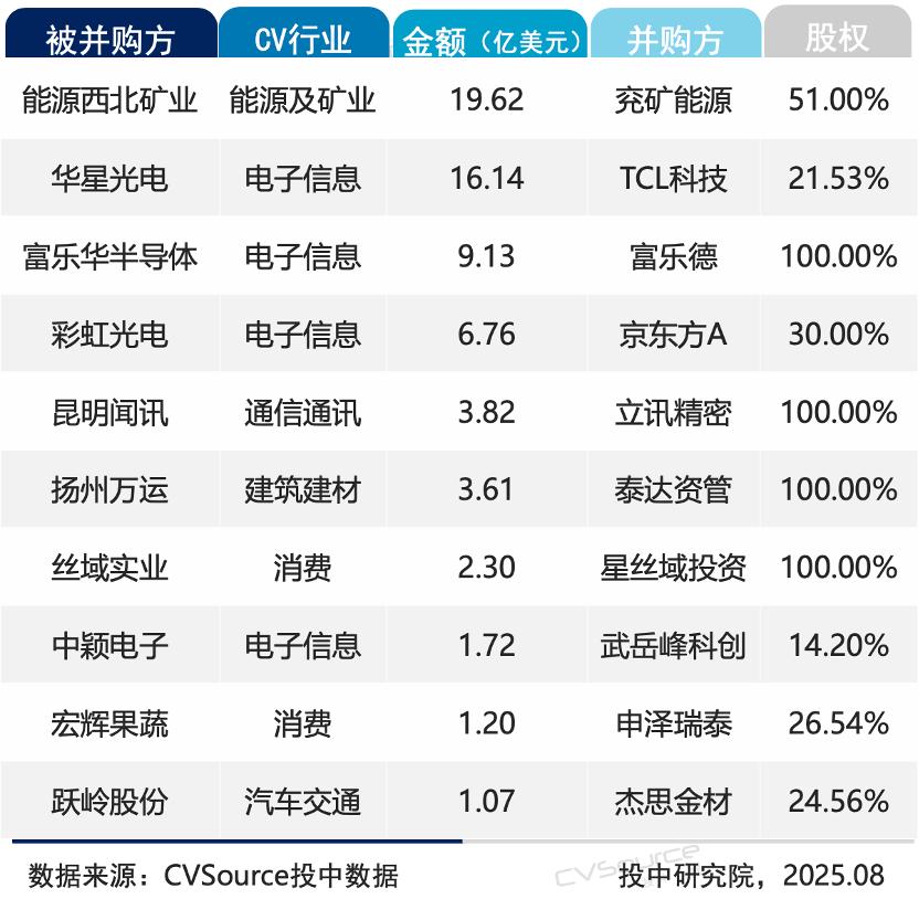 其中,兗礦能源收購西北礦業(yè)51%股權(交易金額19.62億美元)、富樂德收購富樂華半導體(交易金額9.13億美元)、京東方收購彩虹光電30%股權(交易金額6.76億美元)等,都是本月大額交易的代表。
