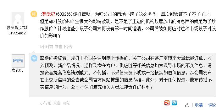 8月12日晚,中國AI芯片領域的“寒王”寒武紀在互動平臺回應投資者提問,稱網(wǎng)上傳播的關于公司在某廠商預定大量載板訂單、收入預測、新產(chǎn)品情況、送樣及潛在客戶、供應鏈等信息,均為誤導市場的不實信息。
