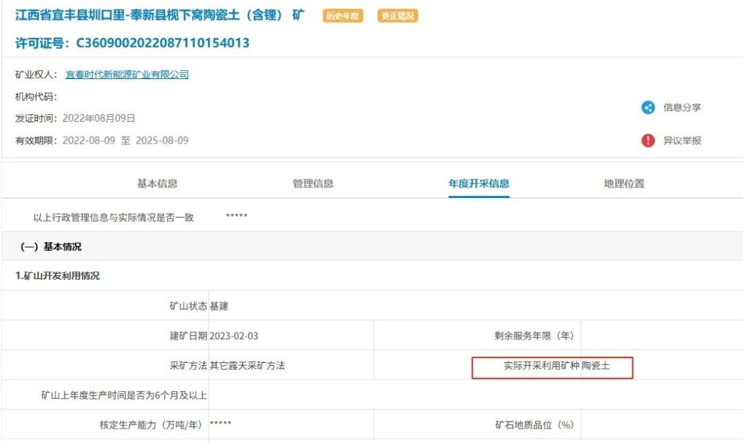 2022年4月,寧德時代控股孫公司宜春時代新能源礦業(yè)有限公司(以下簡稱“宜春時代”,寧德時代間接控股65%,宜春市礦業(yè)有限責任公司控股35%)以8.65億元的價格競得枧下窩礦區(qū)普查探礦權時,鋰價正處在50萬元/噸左右的價格高點。因此,在宜春當?shù)?,掛“陶瓷土”開“鋰云母”的礦山還有許多。據(jù)全國礦業(yè)權人勘查開采信息管理系統(tǒng),江特電機旗下獅子嶺礦區(qū)含鋰瓷石礦(采礦證到期未續(xù))、奉新縣南方礦業(yè)有限公司白水瓷石礦(停產(chǎn))登記的開采礦種均為陶瓷土。時代周報還注意到,宜春時代(持股30%)與江西永興特鋼新能源科技有限公司共同間接控股的宜豐縣花橋鄉(xiāng)白市化山瓷石礦、宜春時代(持股30%)與江西九嶺鋰業(yè)股份有限公司共同控股的花橋大港瓷土礦目前登記的實際開采礦種亦為陶瓷土,后者采礦證有效期至2029年12月24日。