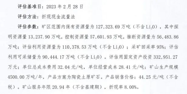 品位方面,枧下窩礦區(qū)氧化鋰平均品位僅約0.27%。其中,礦區(qū)陶瓷土(含鋰)礦體氧化鋰品位最低為0.20%,最高為0.43%,品位變化系數(shù)17%,屬品位變化均勻型。儲量方面,枧下窩礦區(qū)范圍內(nèi)保有資源量為12.73億噸,評估利用資源量為11.04億噸;評估利用可采儲量為9.04億噸。但2023年《江西省宜豐縣圳口里 - 奉新縣枧下窩礦區(qū)陶瓷土(含鋰)礦普查探礦權出讓收益評估報告書》中明確指出,上述儲量數(shù)據(jù)中并不含氧化鋰。