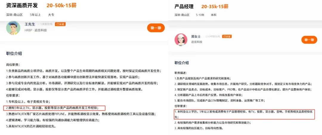 科小編發(fā)現(xiàn),獵聘網(wǎng)站上已發(fā)布資深畫質(zhì)開發(fā)、產(chǎn)品經(jīng)理等崗位,要求有TV、投影等相關品類經(jīng)驗優(yōu)先。