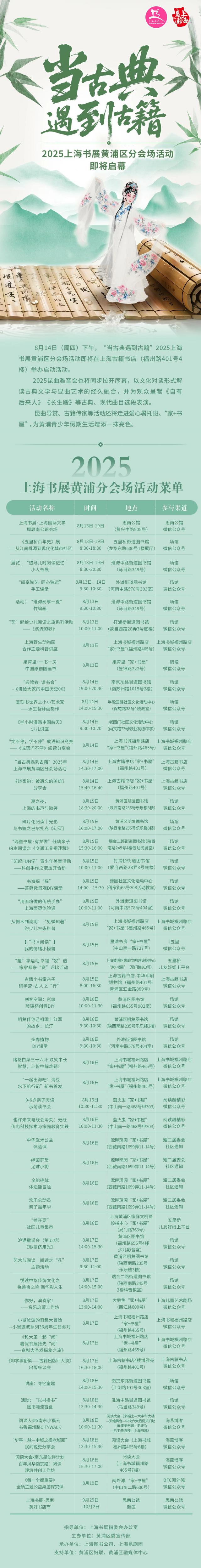 黃浦區(qū)分會(huì)場(chǎng)將在上海古籍書(shū)店、思南公館、黃浦區(qū)圖書(shū)館、明復(fù)圖書(shū)館等24處區(qū)域內(nèi)的文化地標(biāo)、公共圖書(shū)館以及‘家 + 書(shū)屋’,舉辦50場(chǎng)活動(dòng)?;顒?dòng)以‘當(dāng)古典遇到古籍’為主題,為市民帶來(lái)一場(chǎng)書(shū)卷氣與煙火氣并存的閱讀之旅。啟動(dòng)活動(dòng)將于8月14日在上海古籍書(shū)店舉行。