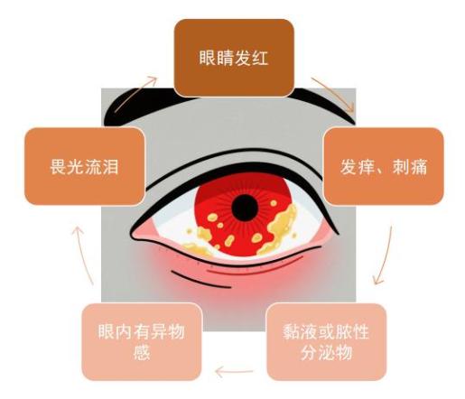 ●眼睛發(fā)紅 ●眼睛發(fā)癢、刺痛 ●眼內(nèi)有異物感 ●畏光流淚 ●黏液或膿性分泌物