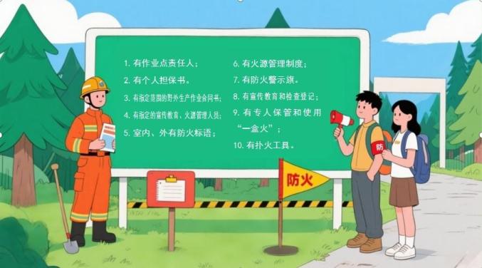 要做到“十有”,即有作業(yè)點(diǎn)責(zé)任人;有個(gè)人擔(dān)保書;有指定范圍的野外生產(chǎn)作業(yè)合同書;有指定的宣傳教育、火源管理人員;室內(nèi)、外有防火標(biāo)語;有火源管理制度;有防火警示旗;有宣傳教育和檢查登記;有專人保管和使用“一盒火”;有撲火工具。