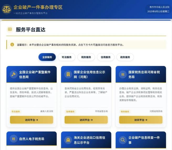 為推動(dòng)破產(chǎn)事務(wù)辦理從“一窗通辦”向“一網(wǎng)通辦”的數(shù)字化轉(zhuǎn)變,解決企業(yè)破產(chǎn)事務(wù)線上辦理中“平臺(tái)多、查找難、切換繁”的難題,焦作中院全新推出企業(yè)破產(chǎn)“一件事”線上服務(wù)平臺(tái)。該平臺(tái)整合了全國企業(yè)破產(chǎn)重整案件信息網(wǎng)、國家稅務(wù)總局河南省稅務(wù)局等9大權(quán)威服務(wù)入口,打造了“一站式導(dǎo)航樞紐”。相關(guān)主體無需在多個(gè)網(wǎng)址間反復(fù)搜索,通過這一個(gè)平臺(tái)就能直達(dá)所有核心服務(wù),大大提高了辦事效率。