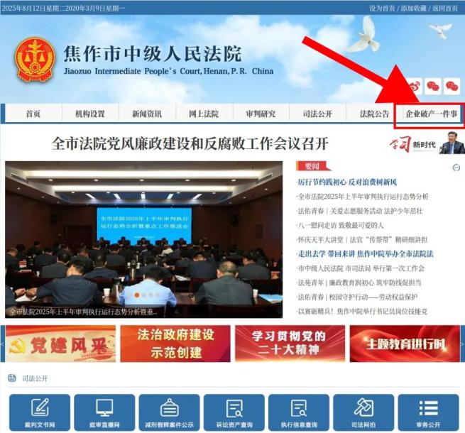 即日起,全省破產(chǎn)管理人、企業(yè)可通過焦作市中級(jí)人民法院官方網(wǎng)站“企業(yè)破產(chǎn)一件事”入口或網(wǎng)址直接訪問“企業(yè)破產(chǎn)一件事”網(wǎng)站,體驗(yàn)“一鍵直達(dá)”的便捷服務(wù)。