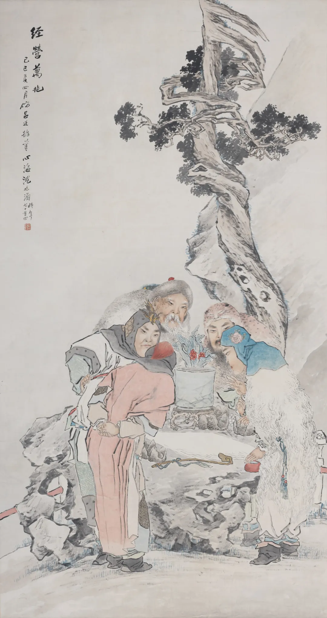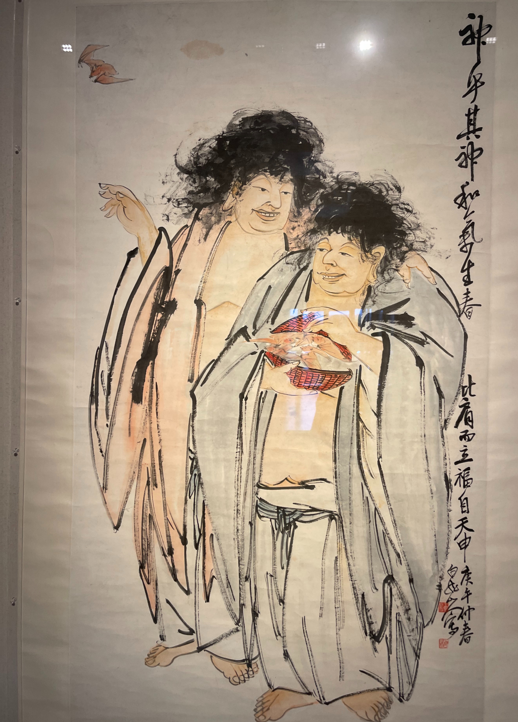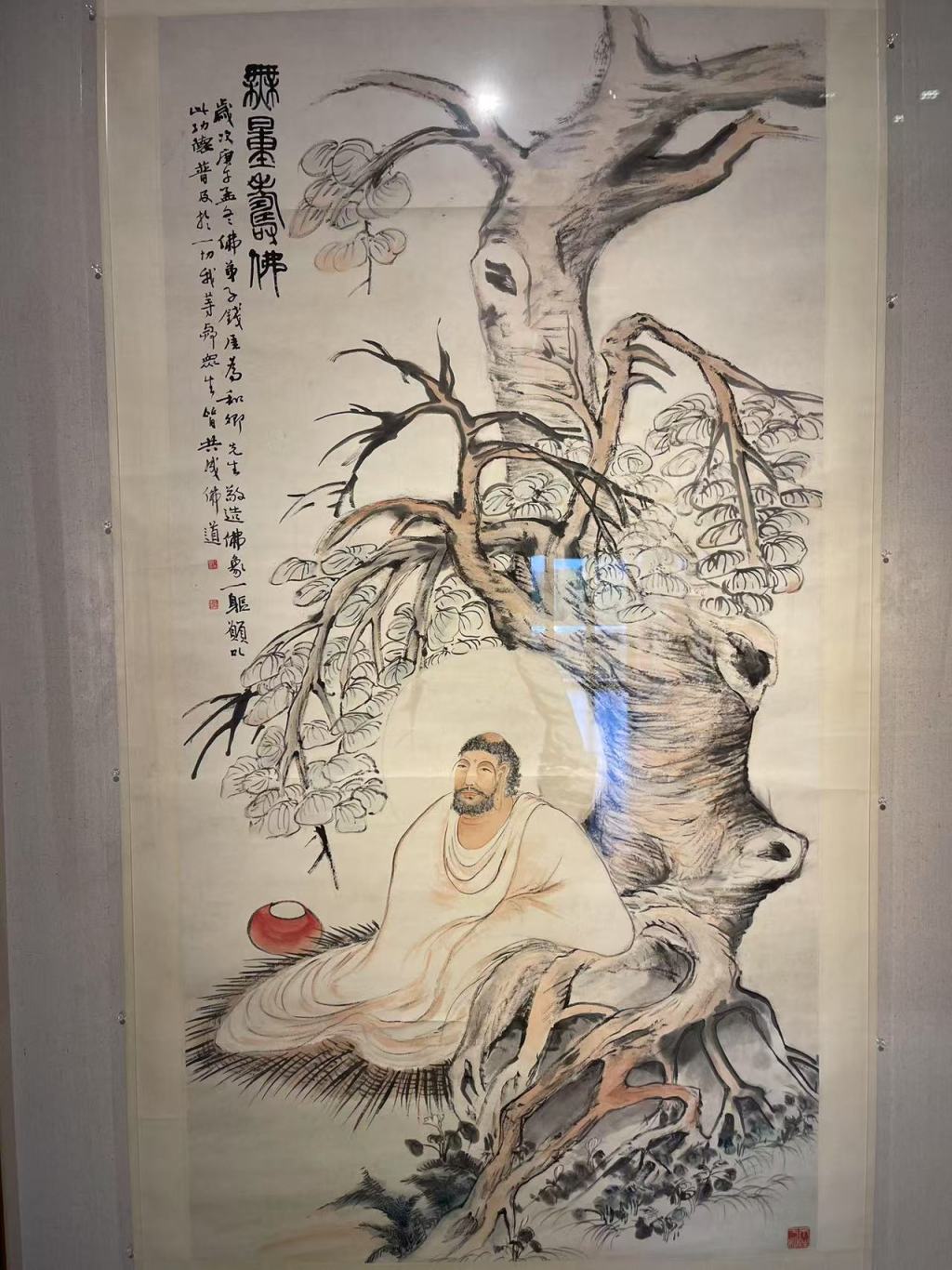 錢瘦鐵的《無量壽佛圖》用簡練線條勾勒出生動形象,搭配古樹與題跋,既有文人畫意趣,又有時代新風(fēng);江寒汀、唐云、張中原合作的 《花鳥 》有華新羅的遺韻,畫面清麗秀雅。