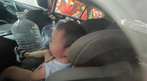 因車內空間密閉且溫度持續(xù)攀升,幼童熱得滿頭大汗、臉部通紅,衣物也被汗水浸透,情況十分緊急。