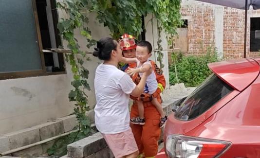 到場消防員發(fā)現(xiàn),3歲左右的幼童被困在車輛后排座位上,孩子母親焦急地在車旁徘徊。