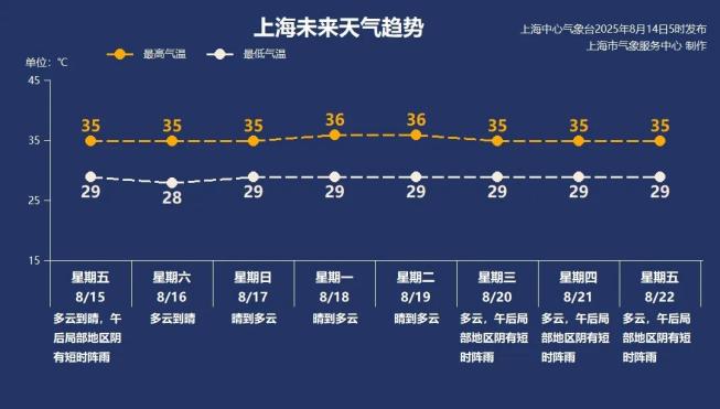 由于副熱帶高壓占據主導地位,未來一周申城最高氣溫將持續(xù)在35 - 36℃。周六至下周初,夏季常見的午后雷陣雨也難以出現。此輪高溫天氣極端最高氣溫約為36℃,而最低氣溫也在29℃上下,可謂是從早熱到晚。
