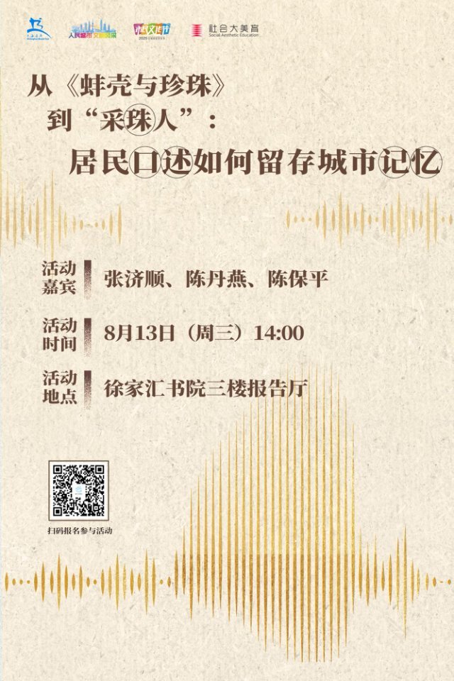 在“光的鑒證”板塊,8月13日、8月15日,徐家匯書院舉辦尋找“采珠人”居民口述史系列活動。以《蚌殼與珍珠:上海武康大樓居民口述》為藍本,打造公共圖書館首個口述歷史的“聲音檔案閱覽室”,豐富“建筑可閱讀”形式。屆時,書院邀請張濟順、陳丹燕、陳保平、馮筱才等嘉賓,鼓勵市民成為社區(qū)歷史的“采珠人”,傳承徐匯記憶。