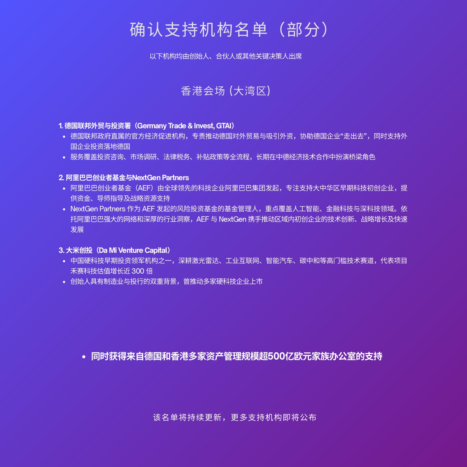 如果你正在尋求融資,并且計(jì)劃在歐洲實(shí)現(xiàn)落地,那么本次活動(dòng)將成為你通往中德核心資本圈的關(guān)鍵橋梁——也許這是你今年唯一能夠在一天內(nèi)完成這一對(duì)接的寶貴機(jī)會(huì)。